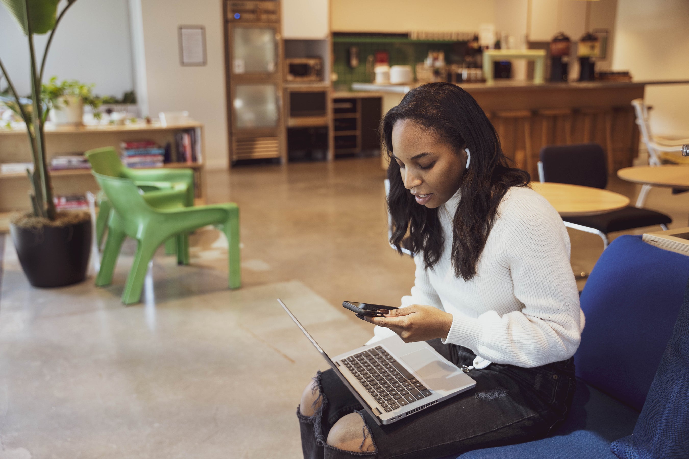 work woman laptop computer working typing technology communicating tablet phone office Office Environment Workplace modern corporate Productivity person indoor clothing wallpublic domain
