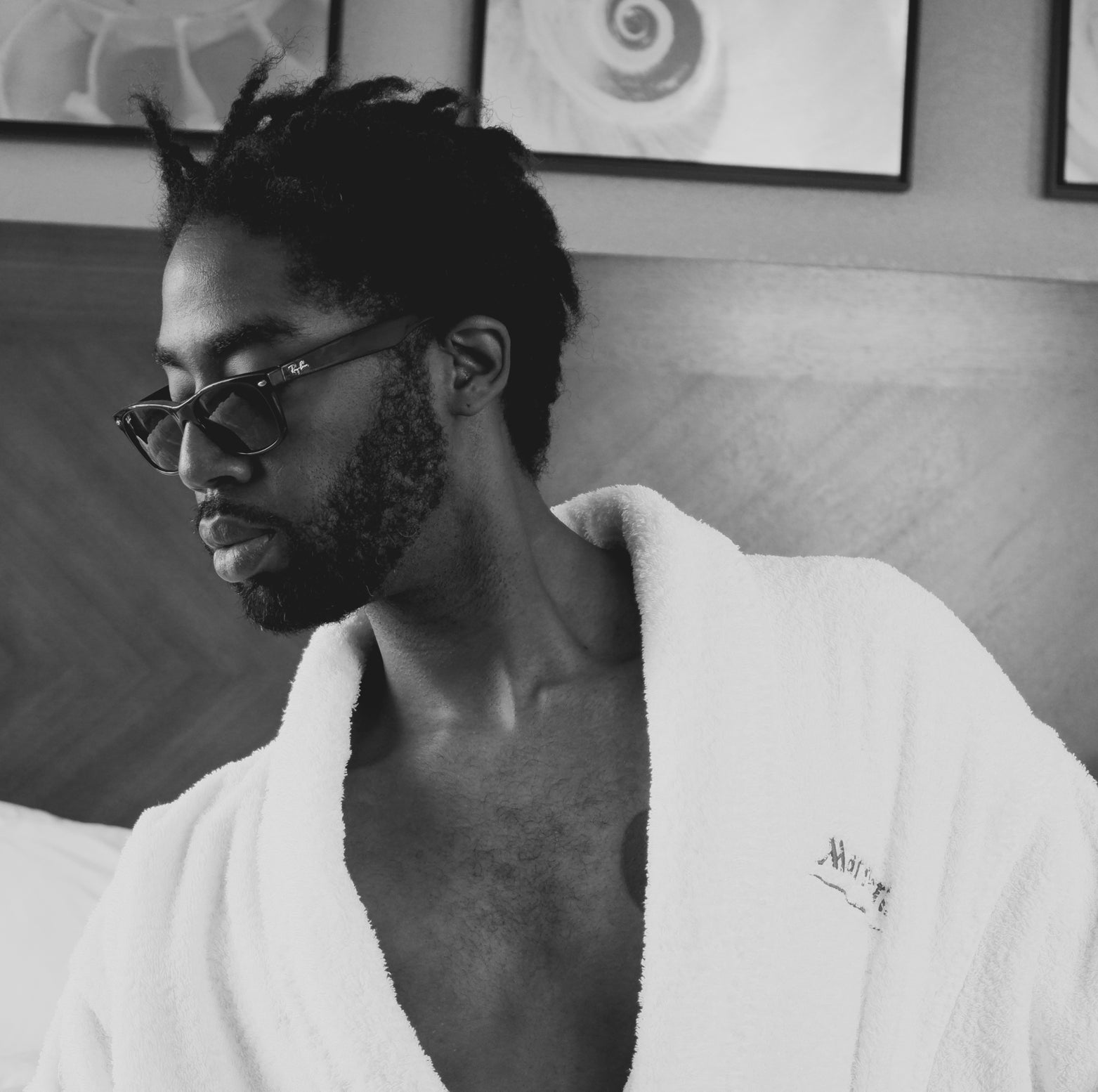 vacation robe sunglasses black and white beard bedroom bed hotel male man human face person indoor glasses clothing wall jaw portrait black hair human beardpublic domain