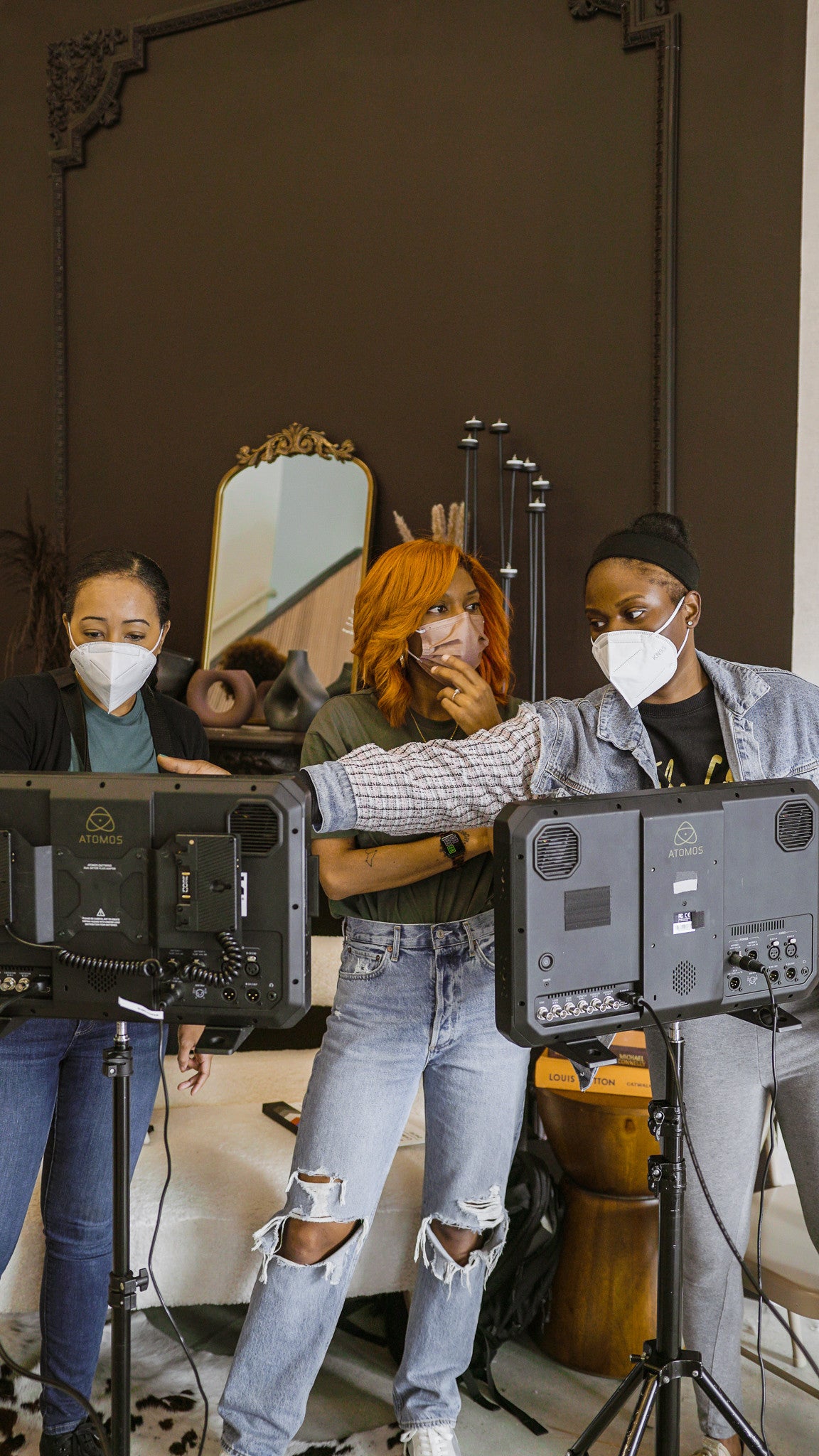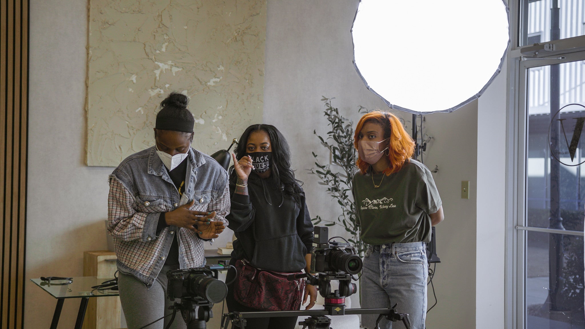 behind the scenes lights photoshoot face mask black woman black women black woman working crew crew member producers production team team teammates workmates buddies sisters workplace plants set clothingpublic domain