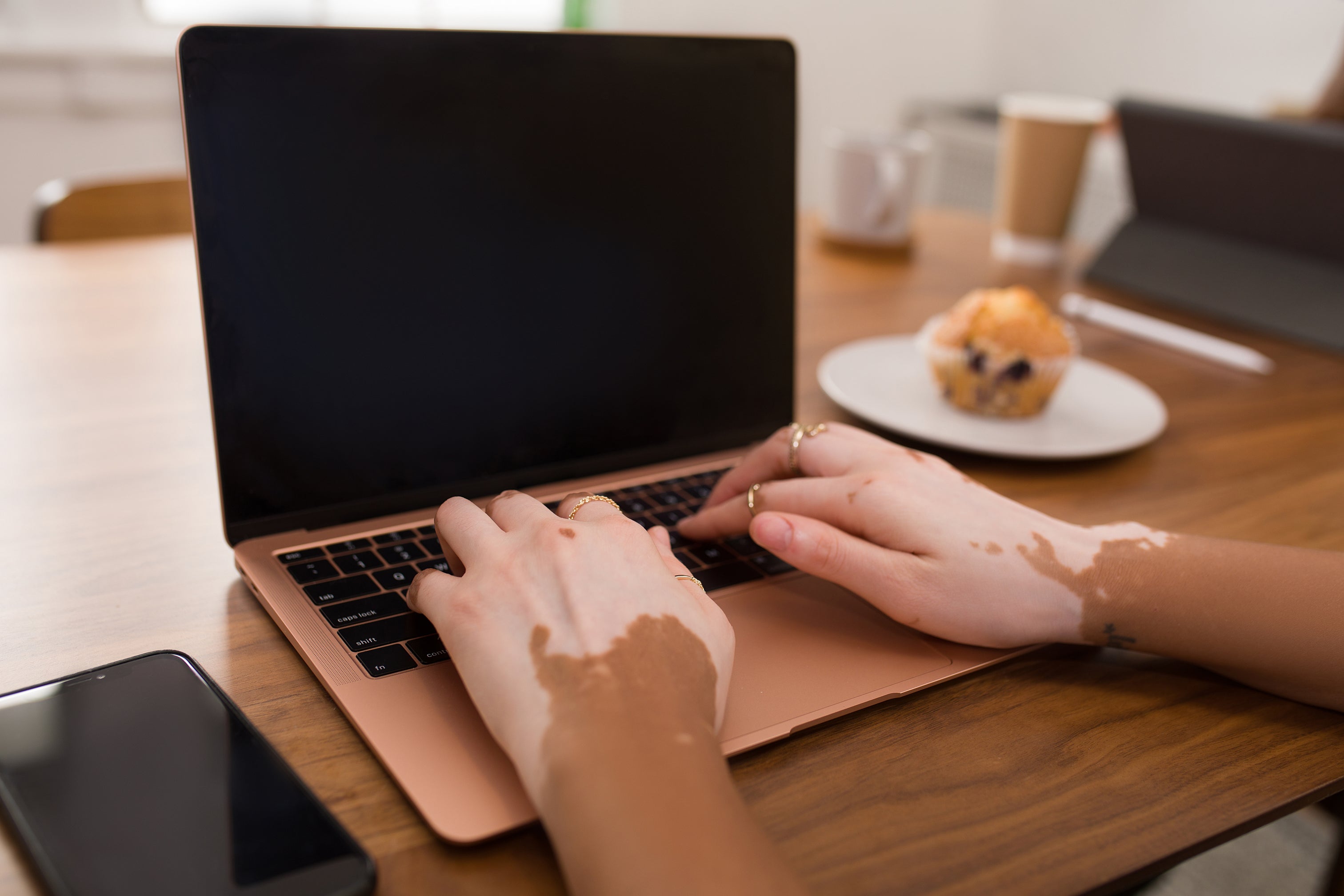 Title: Hands with vitiligo typing on a laptop