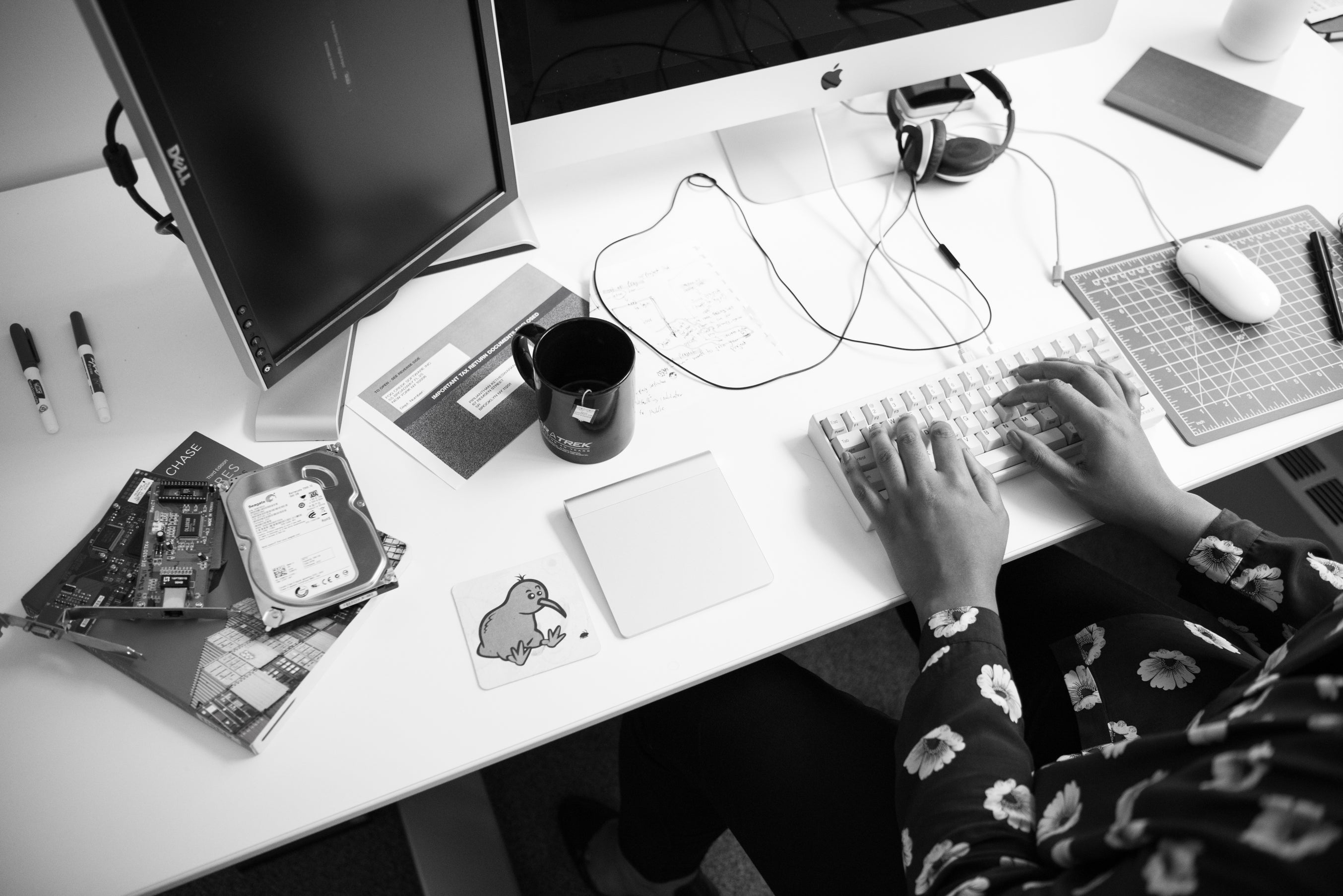 women woman tech color black latina hispanic businesswomen businesswoman entrepreneur engineer developer indoor table desk computer mouse personal computer computer desk black and white office suppliespublic domain