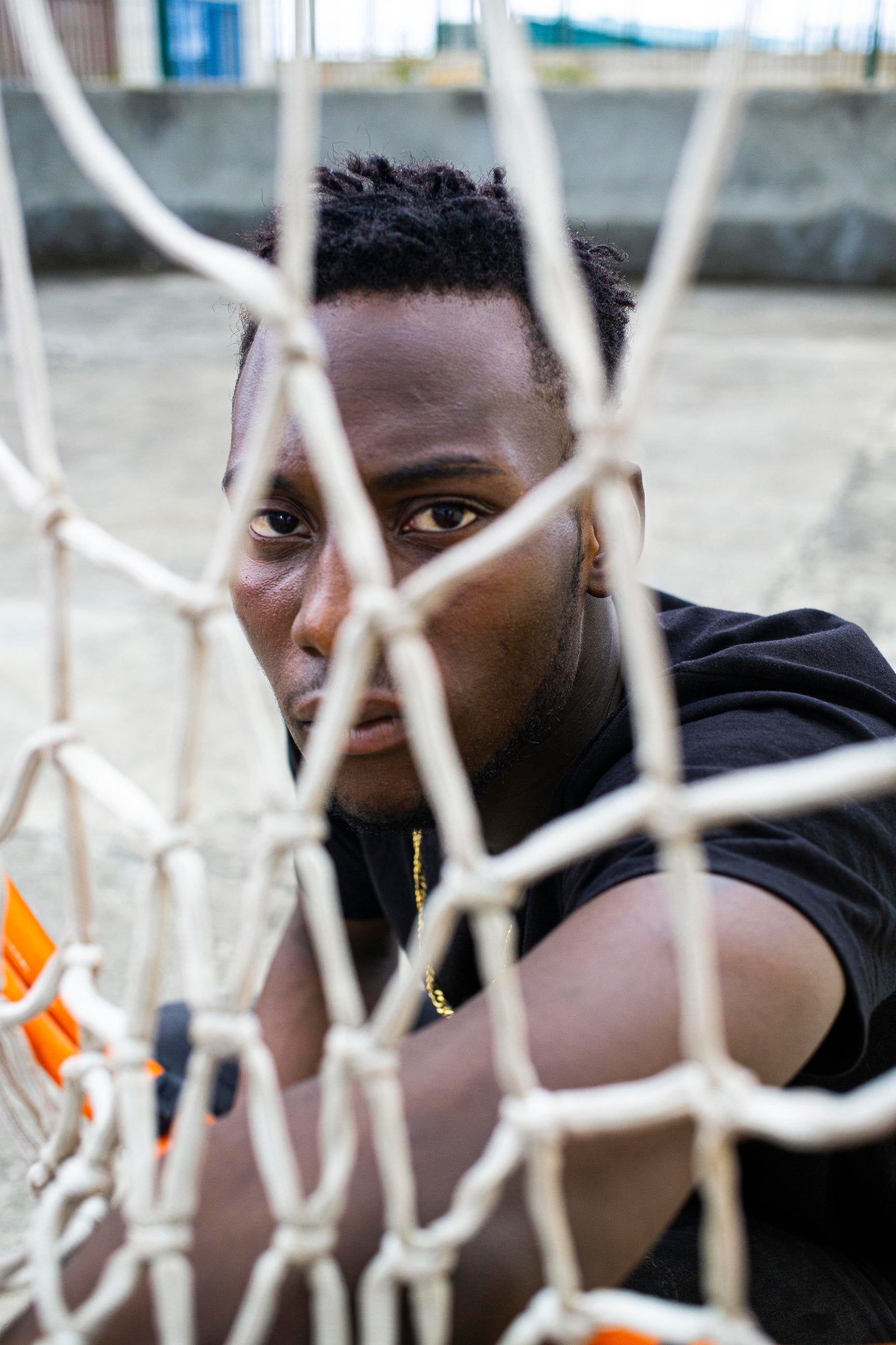 negro net soccer outdoors outside black shirt intense eyes male man person human face chain-link fencing wire fencing mesh outdoor fence sport athletic gamepublic domain