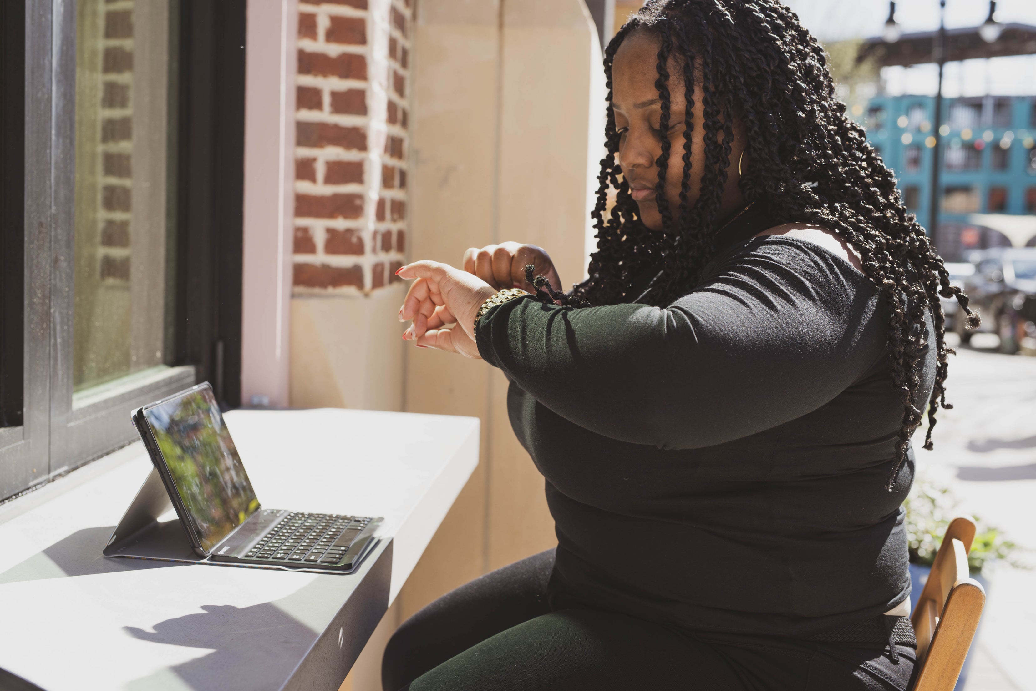 work woman working technology communicating tablet smartwatch digital tech Gadgets Multitasking Mobile Productivity Connectivity Cafe Modern Convenience Wearable person clothingpublic domain