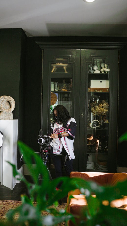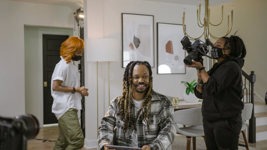 photography camera photoshoot sofa tripod lights videography videographer camerawoman black people black camerawoman production team production staff production crew cinematography film making film film industry occupation owrkplace indoorpublic domain
