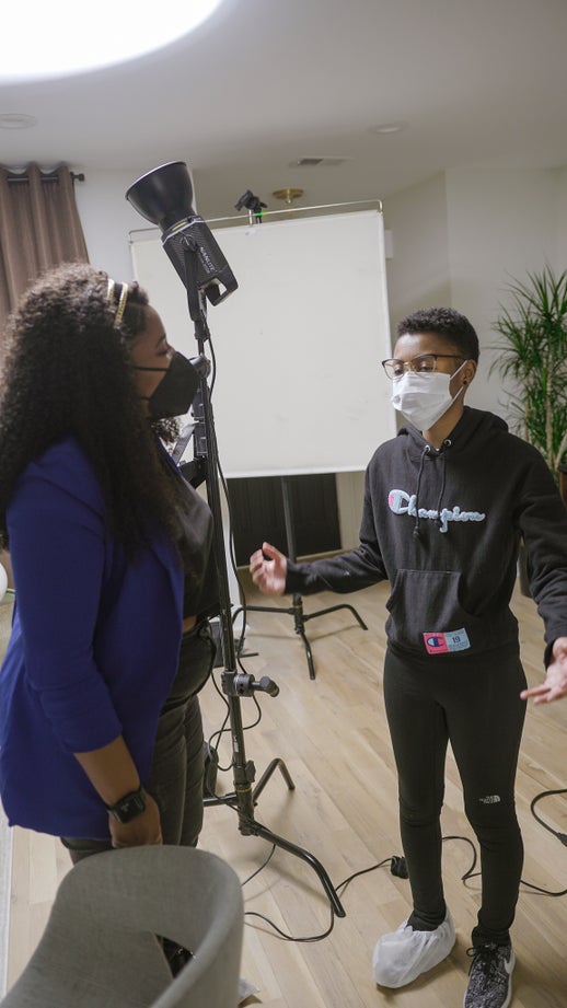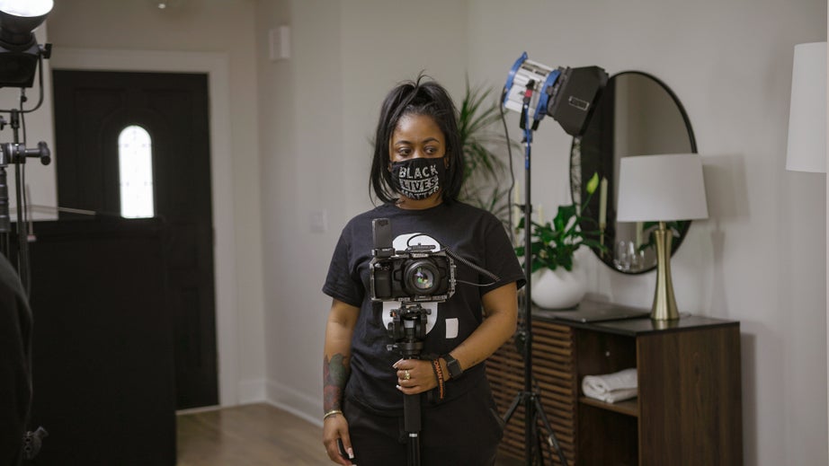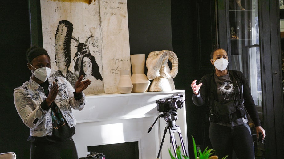 dreads pose camera face mask photoshoot interview photography set workplace videography photographer camerawoman actor preparation filming film making black people black camerawoman production team workmatespublic domain
