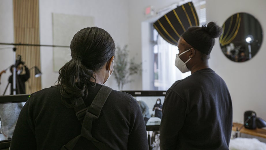 behind the scenes face mask camera photoshoot preparing photography ceiling fan curtain indoor working crew crew member production staff production team producer videography equipment monitor film making workplacepublic domain