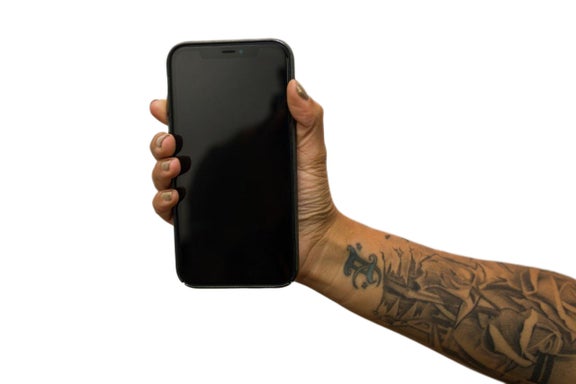 Title: Right hand with tattooed forearm holds phone