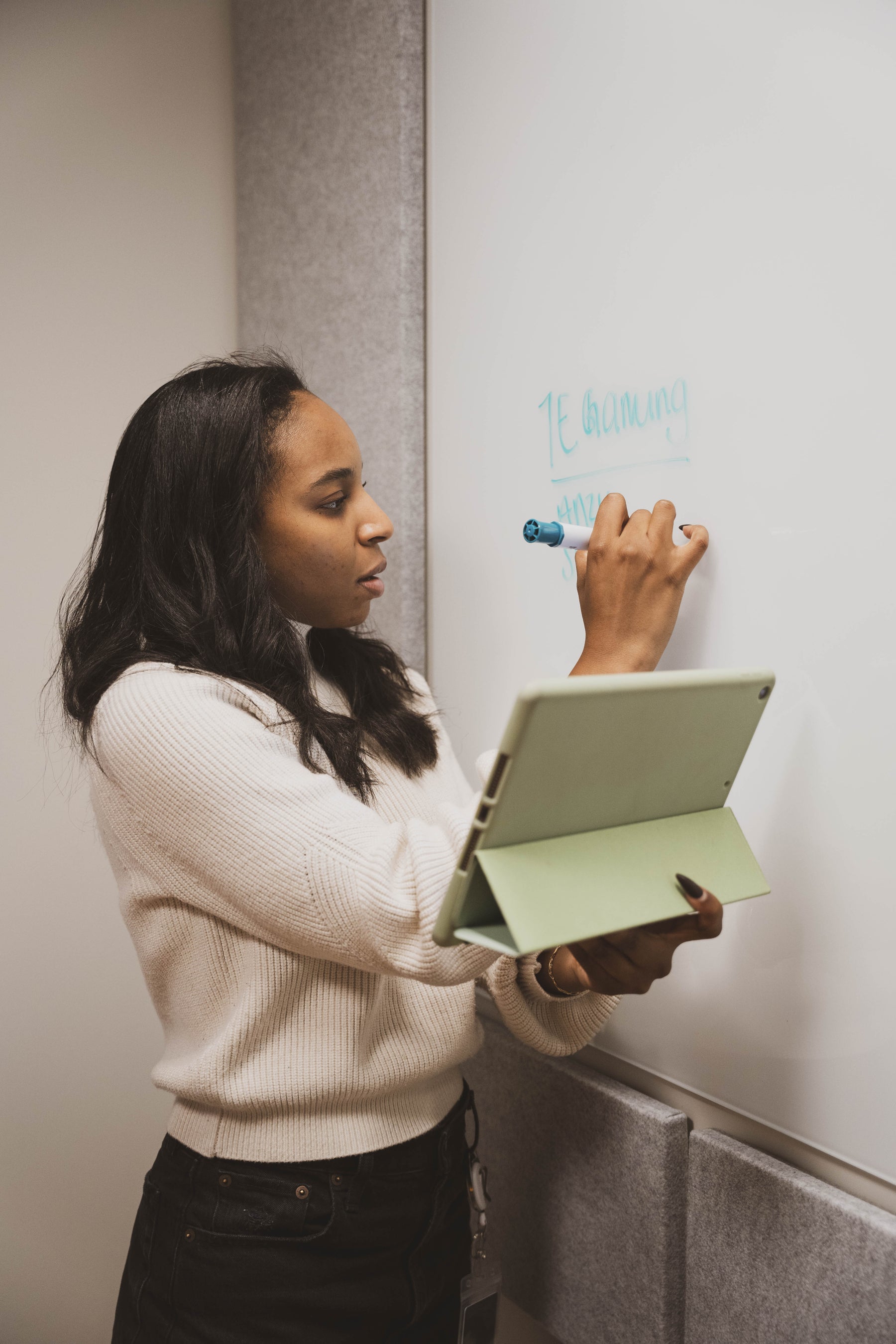 Title: Focused Woman Writing on Whiteboard with Tablet