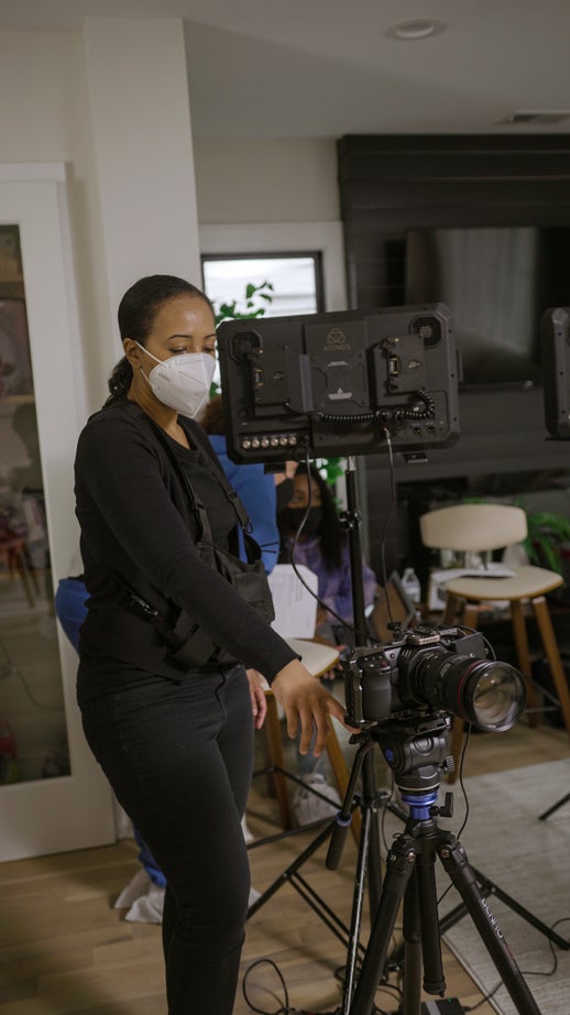 Title: Black Woman behind filming equipment