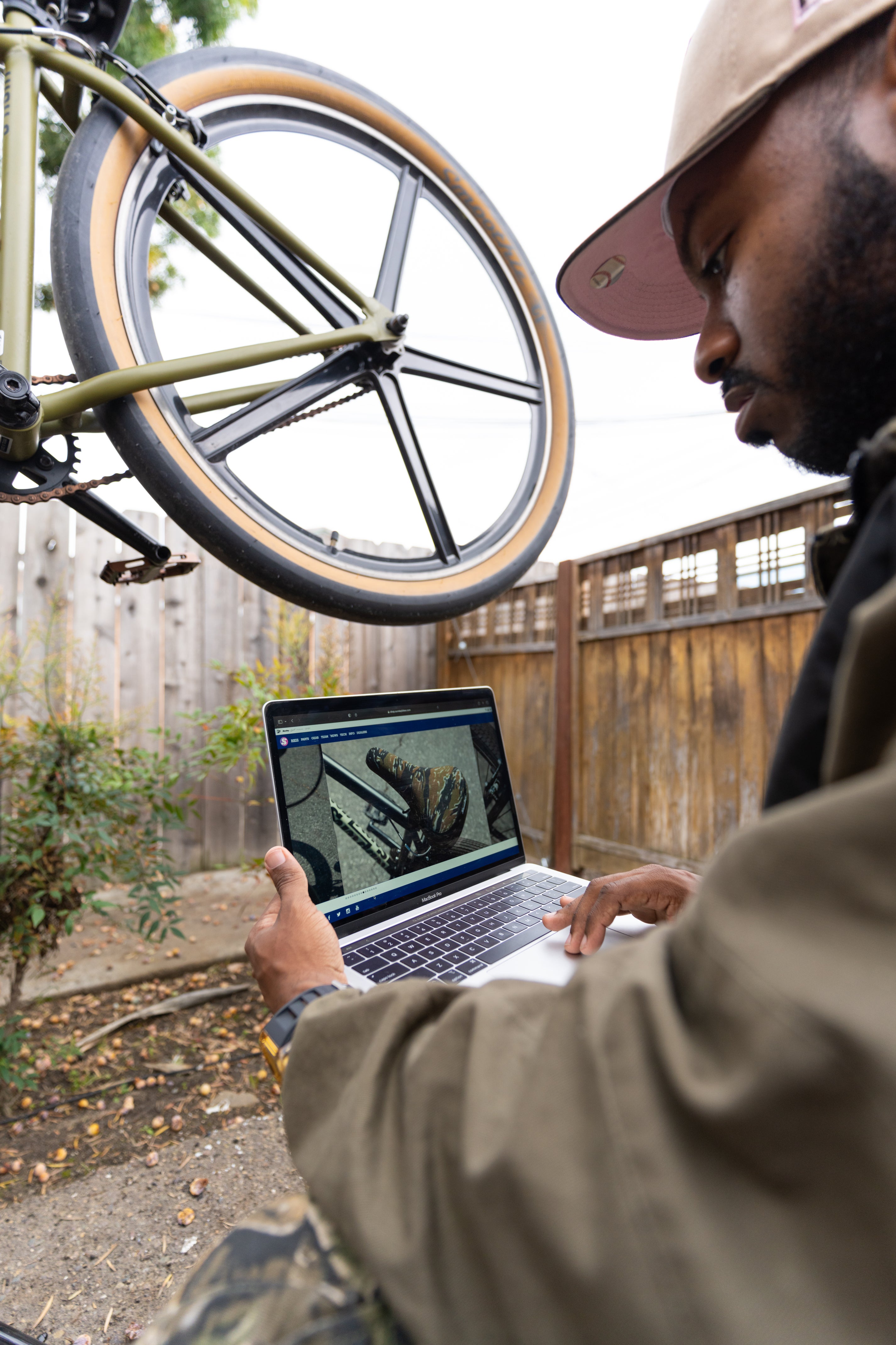 technology laptop tech technologies hi-tech man working computer work outdoor tech bike bicycle wheel tire Maintenance cycling cyclist person outdoor clothingpublic domain
