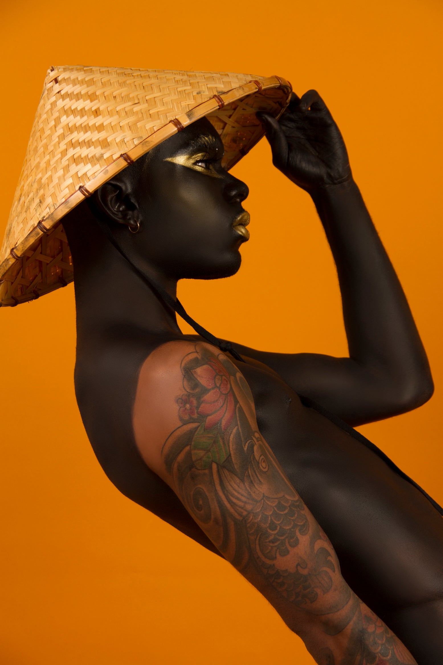 blackman male bodypaint chinese bamboo hat orange background fashion fashion accessory art model personpublic domain