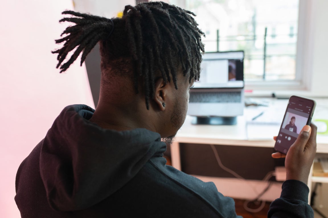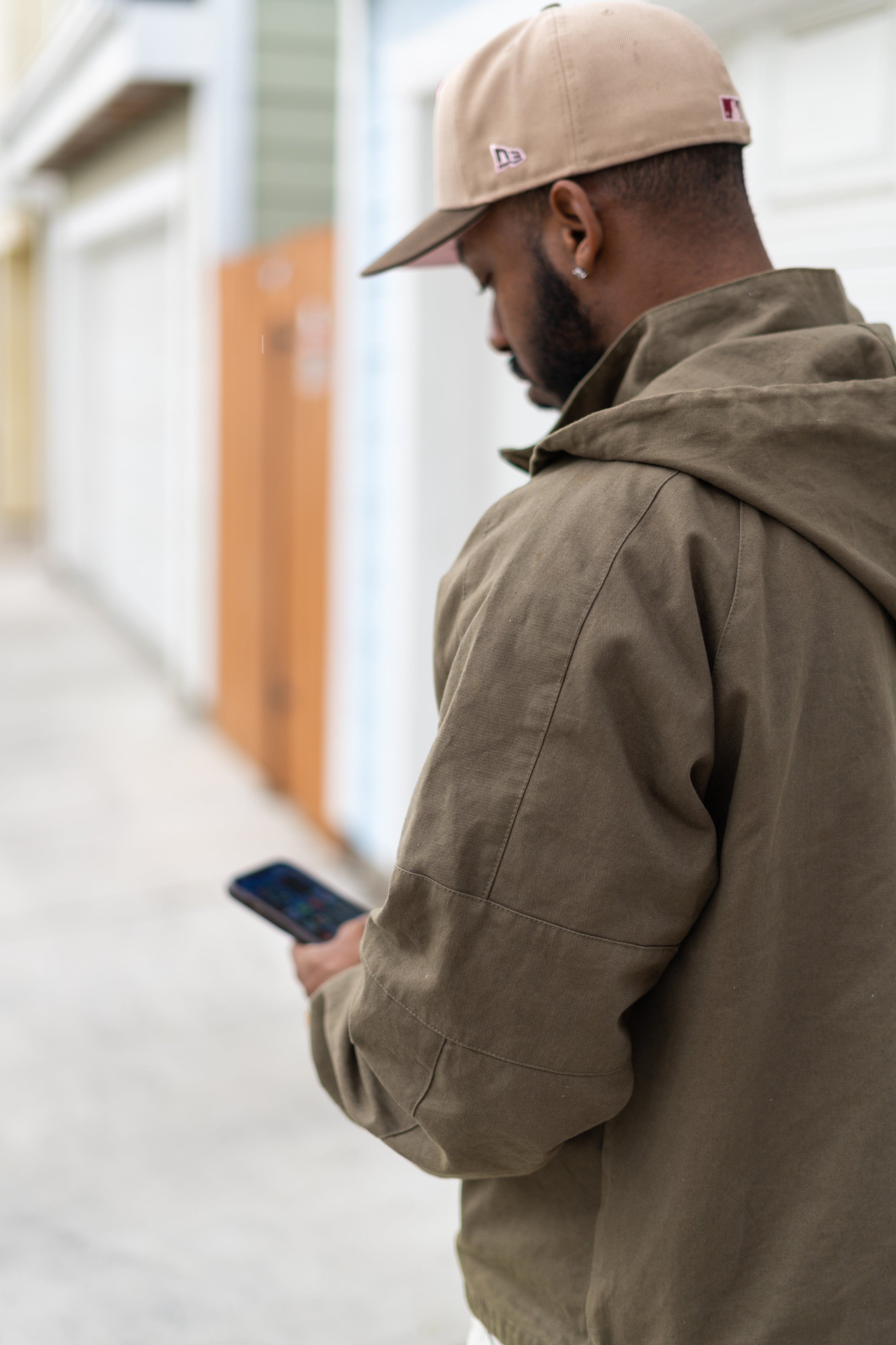 technology phone tech technologies hi-tech man working computer work outdoor tech smartphone city modern Mobile Mobile Device public space road street person clothingpublic domain