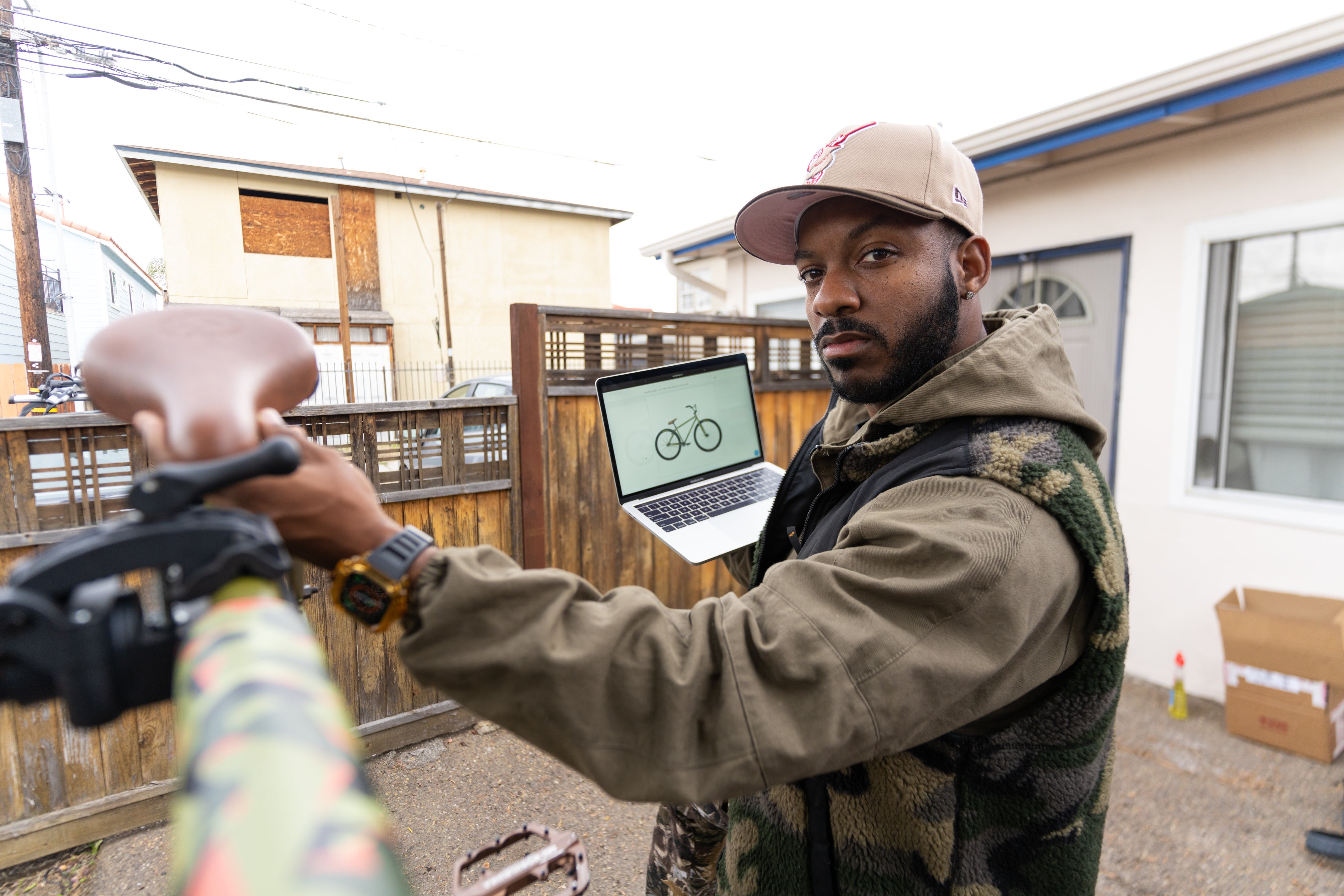 Title: Cycling Enthusiast Checks Bike with Laptop
