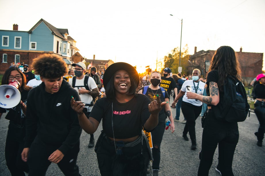 iamenough blackboyjoy blackgirljoy protest smiling black shirt mask covid megaphone black lives matter book bags hoodie t-shirt hat glasses person clothing outdoor sky human facepublic domain