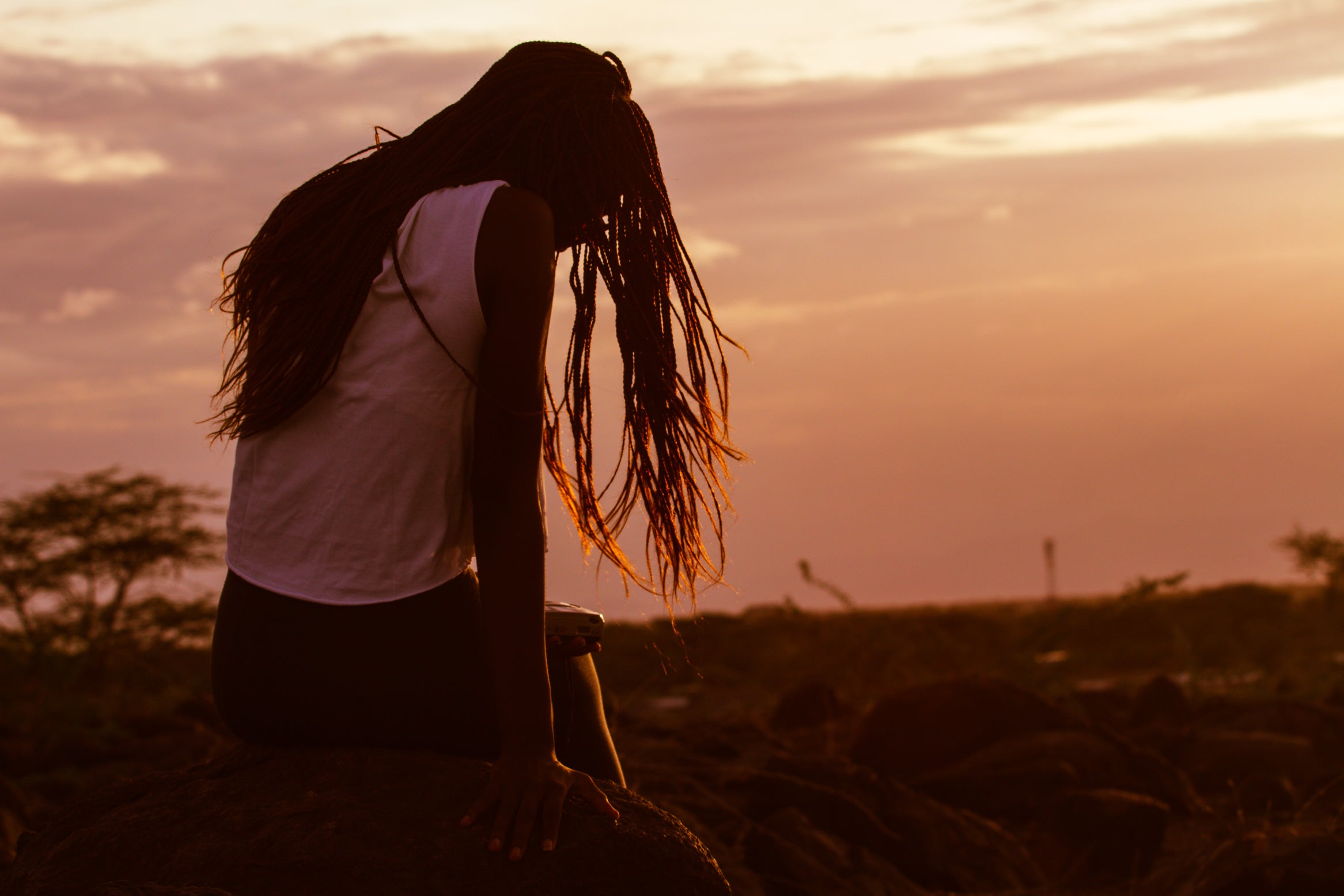 female locs natural hair glasses sunglasses sunset laughing talking orange sunrise outdoors trees silhouette black yellow smile phone lines outside sky_sun outdoorpublic domain
