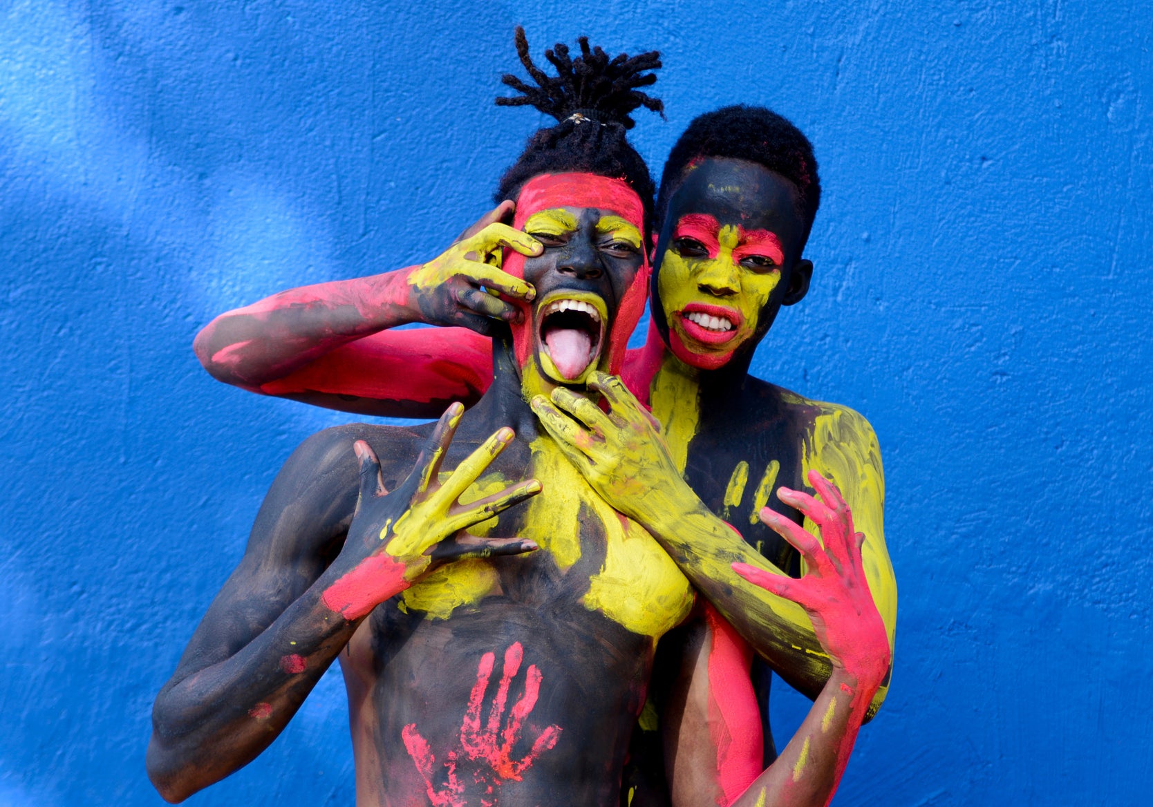 bodypaint artistic hair blue yellow pink man woman intense mouth bun deadlocks short hair skin tribal traditional human face person dance water sportpublic domain