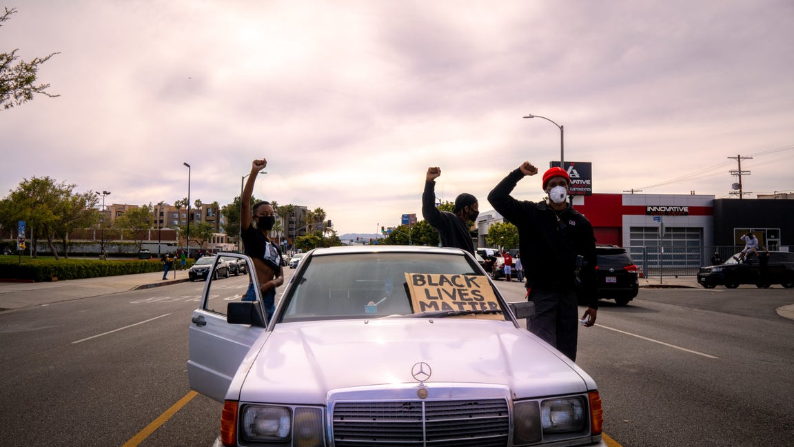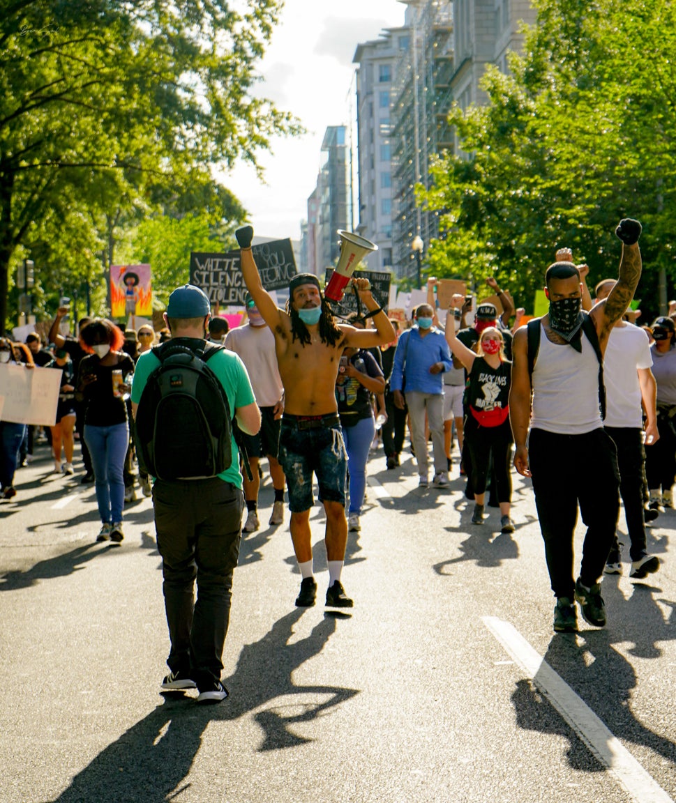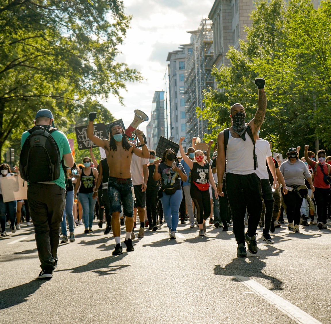 protest civil unrest black lives matter #blacklivesmatter group march rally shout women men blm George Floyd city signs street mask police hands up military black powerpublic domain